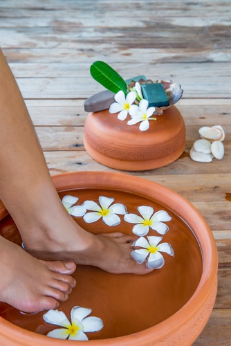 大きめの洗面器やバケツにお湯を入れ、3滴以下の精油を落とし、よくかき混ぜます。そこへ、両足を入れ足首やひざ下まで、ひたします。足浴は、椅子に座りながらできるため、足や腰に負担少なく高齢者でも楽しむことができる方法です。