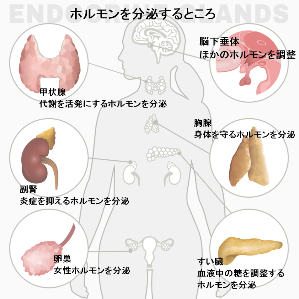 また、ホルモンを分泌するところを「内分泌腺」といいます。内分泌腺は、気管の前にある「甲状腺」、細胞が集まる「すい臓のランゲルハンス島」、左右の腎臓の上にある「副腎」、「男性の精巣」、「女性の卵巣」など大きさや形はさまざまです。さらに、内分泌系をコントロールしているのが「脳下垂体」という場所です。