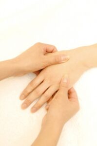 - 相手の手の甲を上にして、相手の指を1本ずつ自分の親指と残りの指ではさんでクルクルと円をかくようにもみほぐす